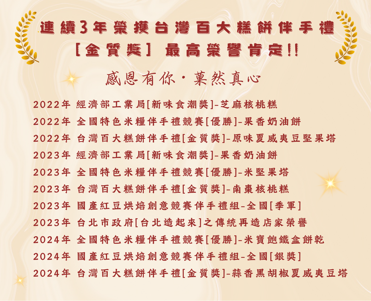 連續四年榮獲台灣百大糕餅伴手禮 [金質獎] ~企業送禮一致推薦~