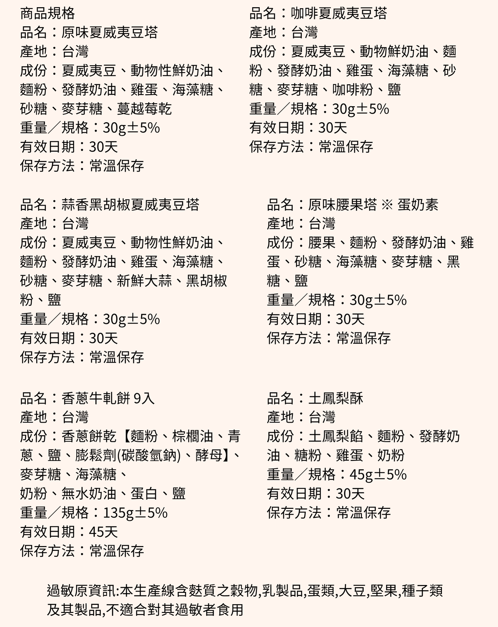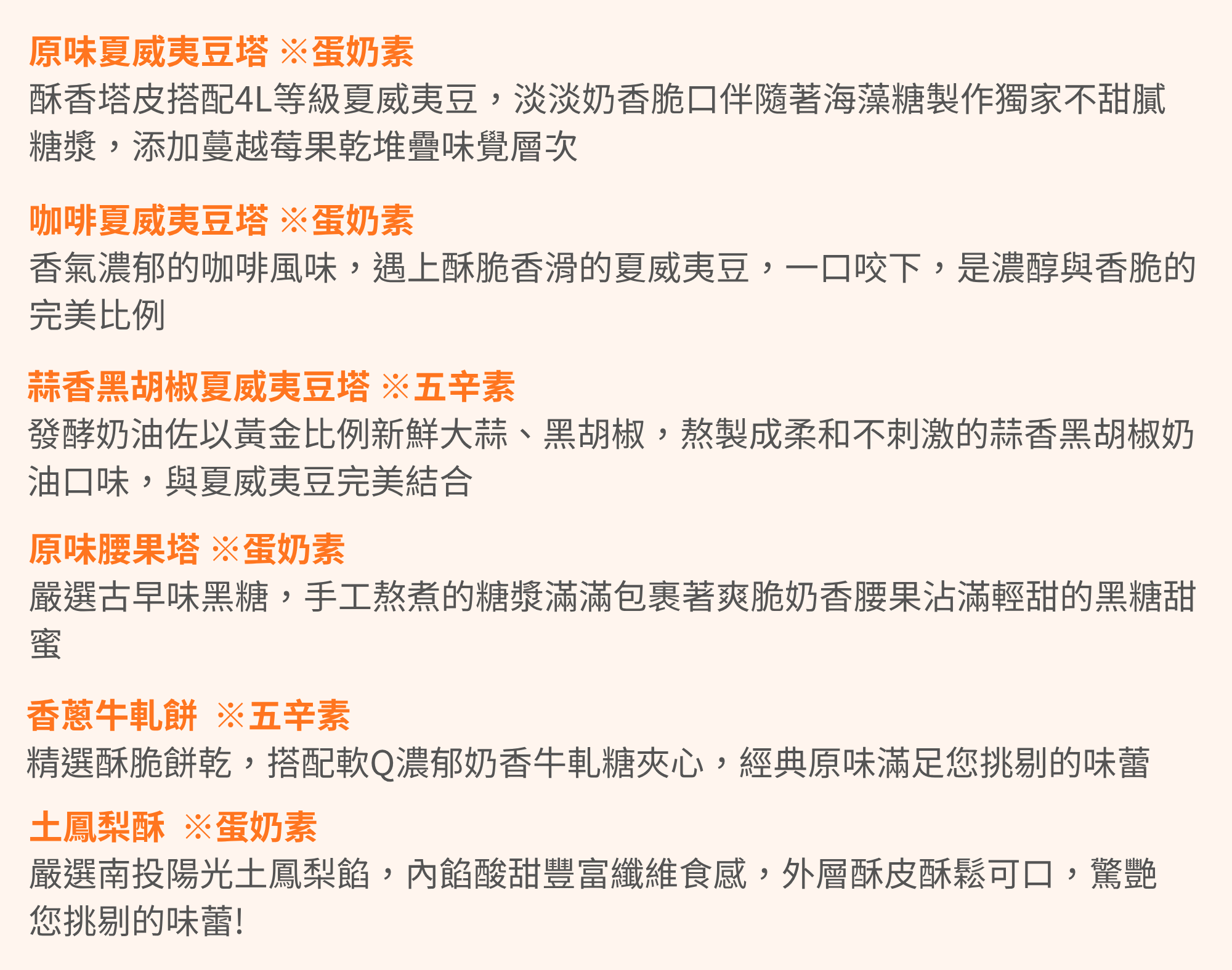 ※商品香蔥牛軋餅、蒜香黑胡椒夏威夷豆堅果塔為五辛素,其他為蛋奶素