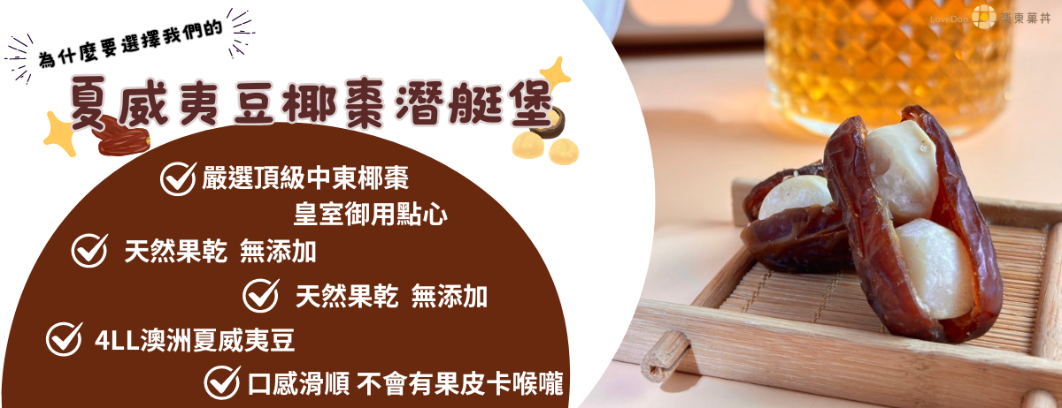 使用上等中東進口椰棗和澳洲4L等級大顆夏威夷豆,像是潛艇堡一樣的造型,師傅們費時人工篩選用心手作良品