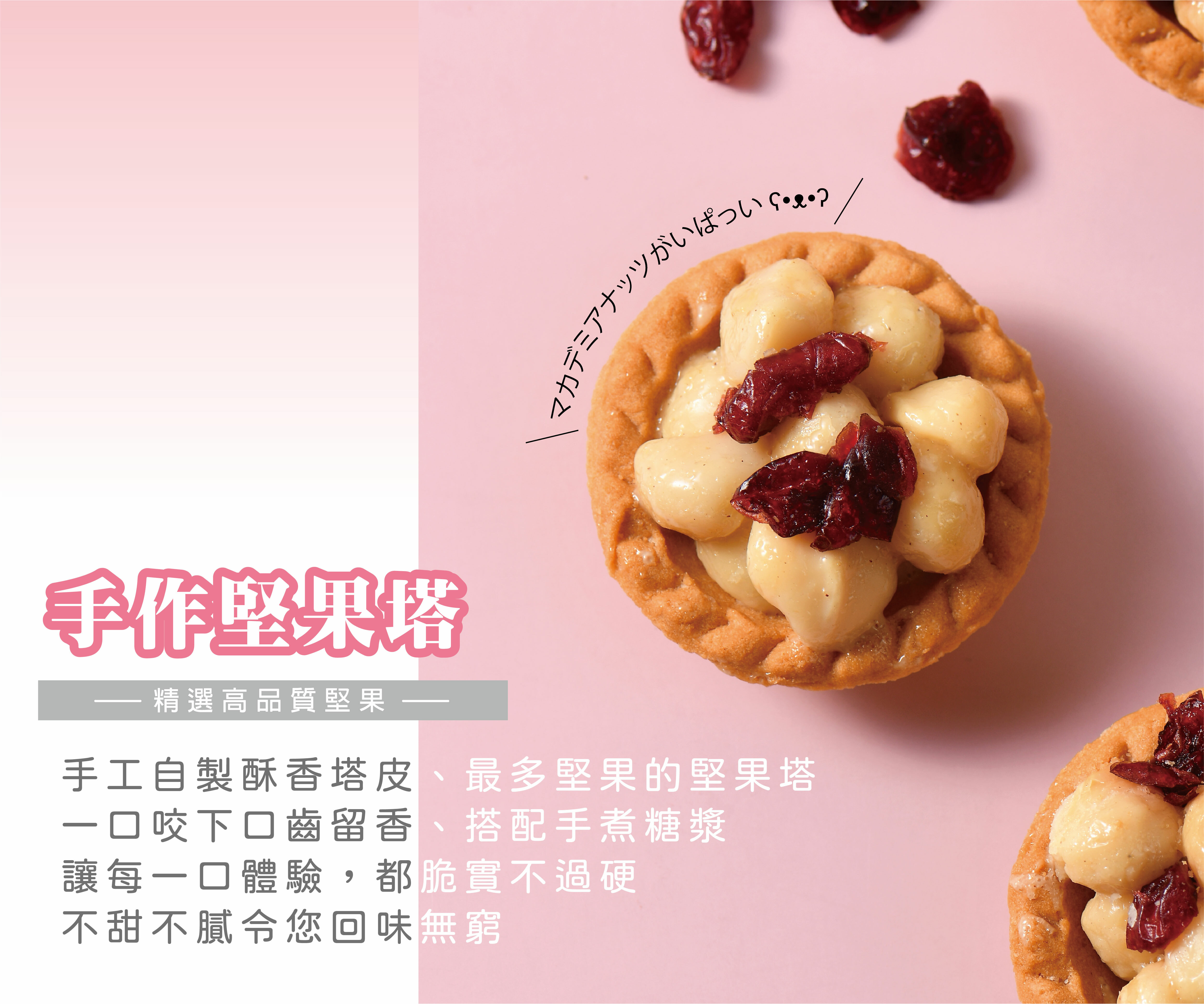 酥香塔皮上裝載滿滿的4L等級夏威夷豆,淡淡奶香脆口夏威夷豆伴隨著海藻糖製作的太妃糖醬,添加酸甜適中的蔓越莓果乾增加味覺層次,一口咬下滿滿幸福味道!