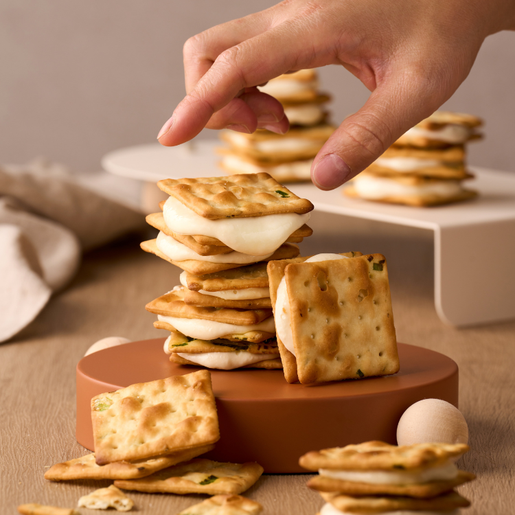 精選酥脆香蔥蘇打餅乾,搭配軟Q濃郁奶香牛軋糖夾心,經典原味滿足您挑剔的味蕾