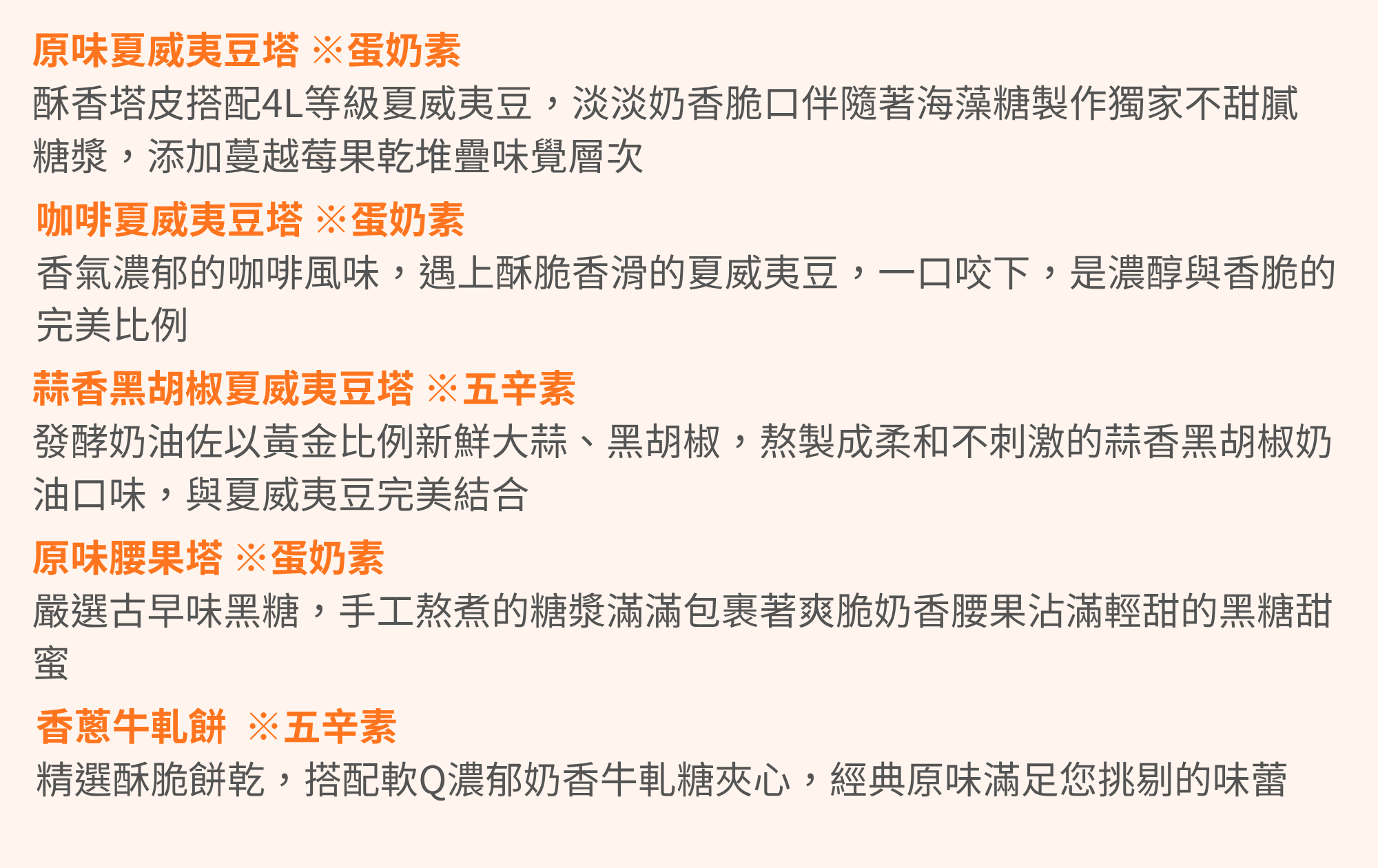 ※商品香蔥牛軋餅、蒜香黑胡椒夏威夷豆堅果塔為五辛素,其他為蛋奶素
