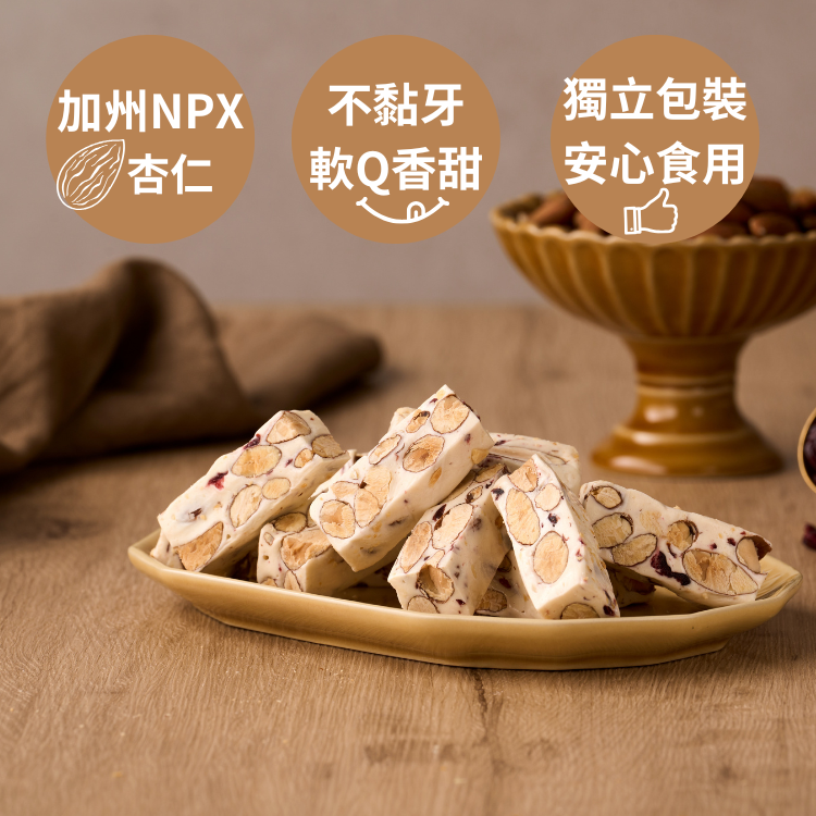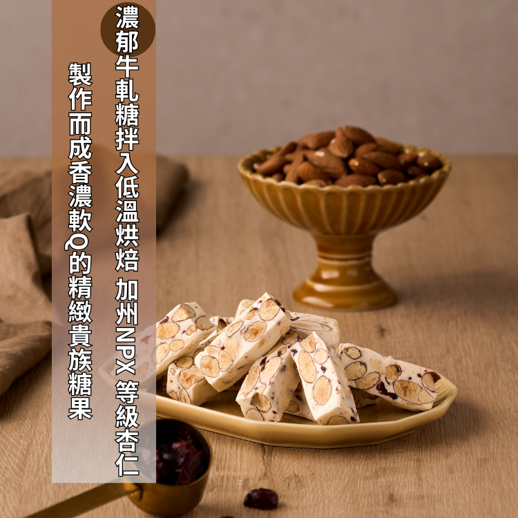 特選海藻糖降低甜度,軟Q香甜濃郁奶香牛軋糖拌入蔓越莓果乾與慢火烘焙新鮮杏仁,低糖不甜膩不黏牙