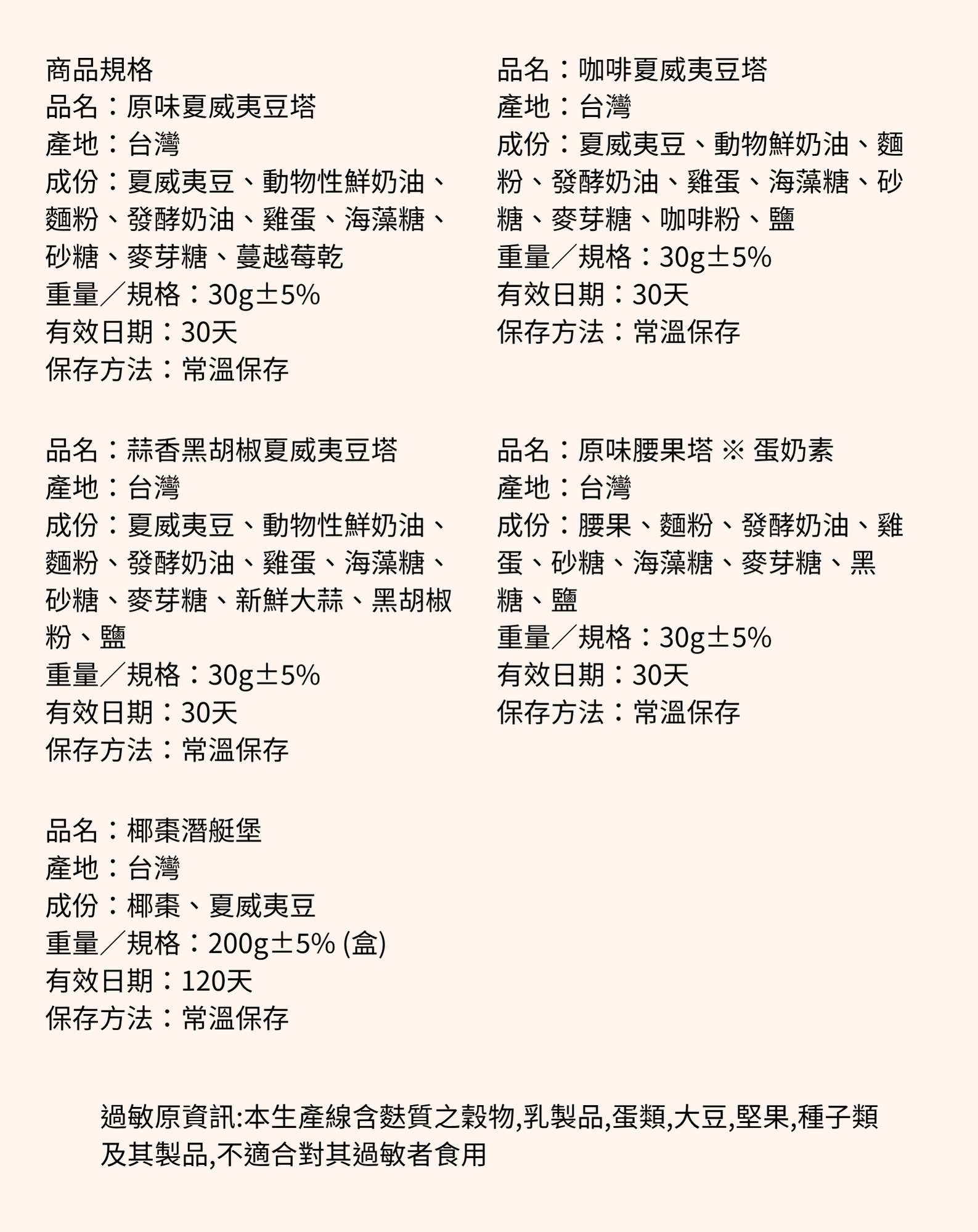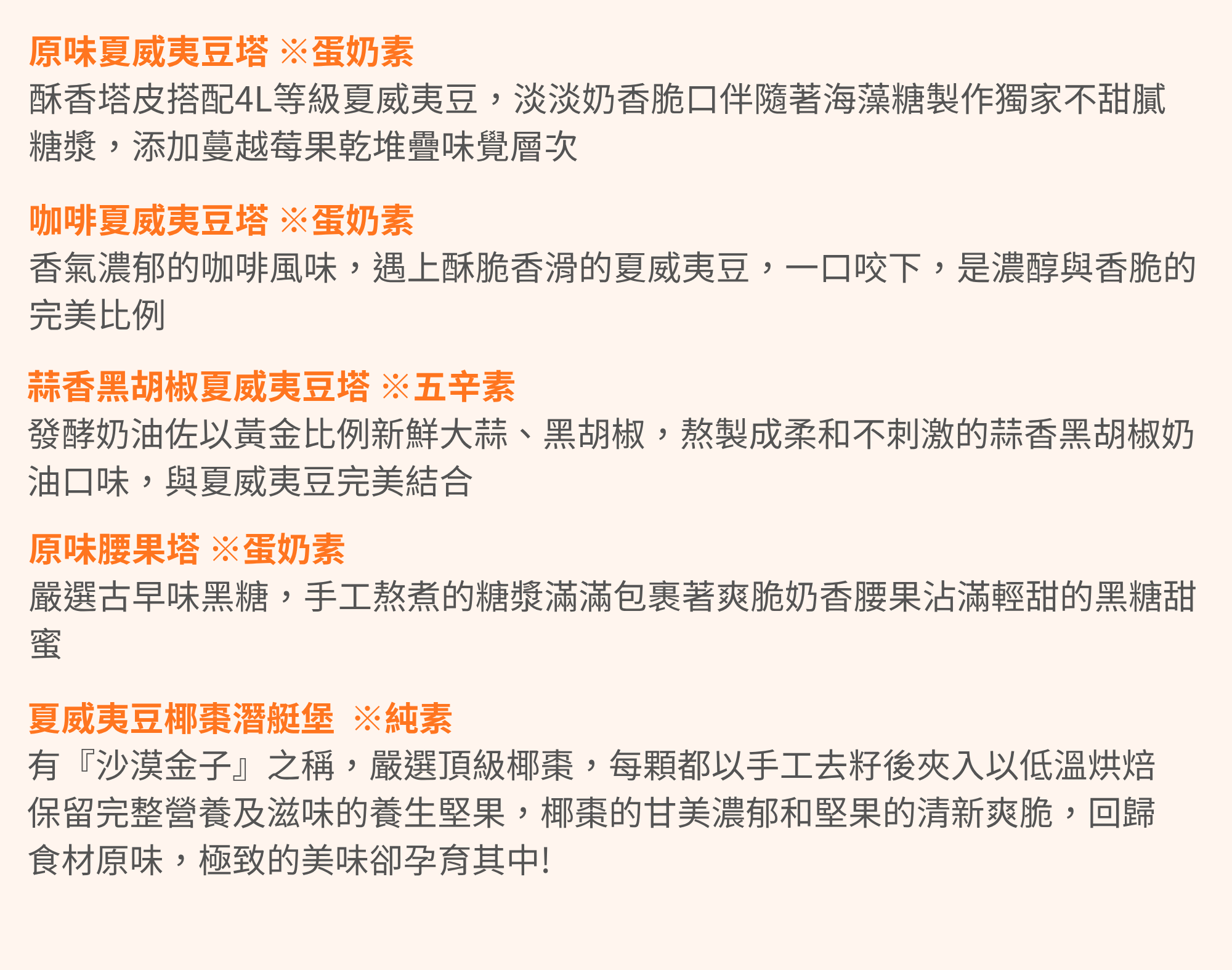 ※商品蒜香黑胡椒夏威夷豆堅果塔為五辛素,其他為蛋奶素,夏威夷豆椰棗潛艇堡為純素