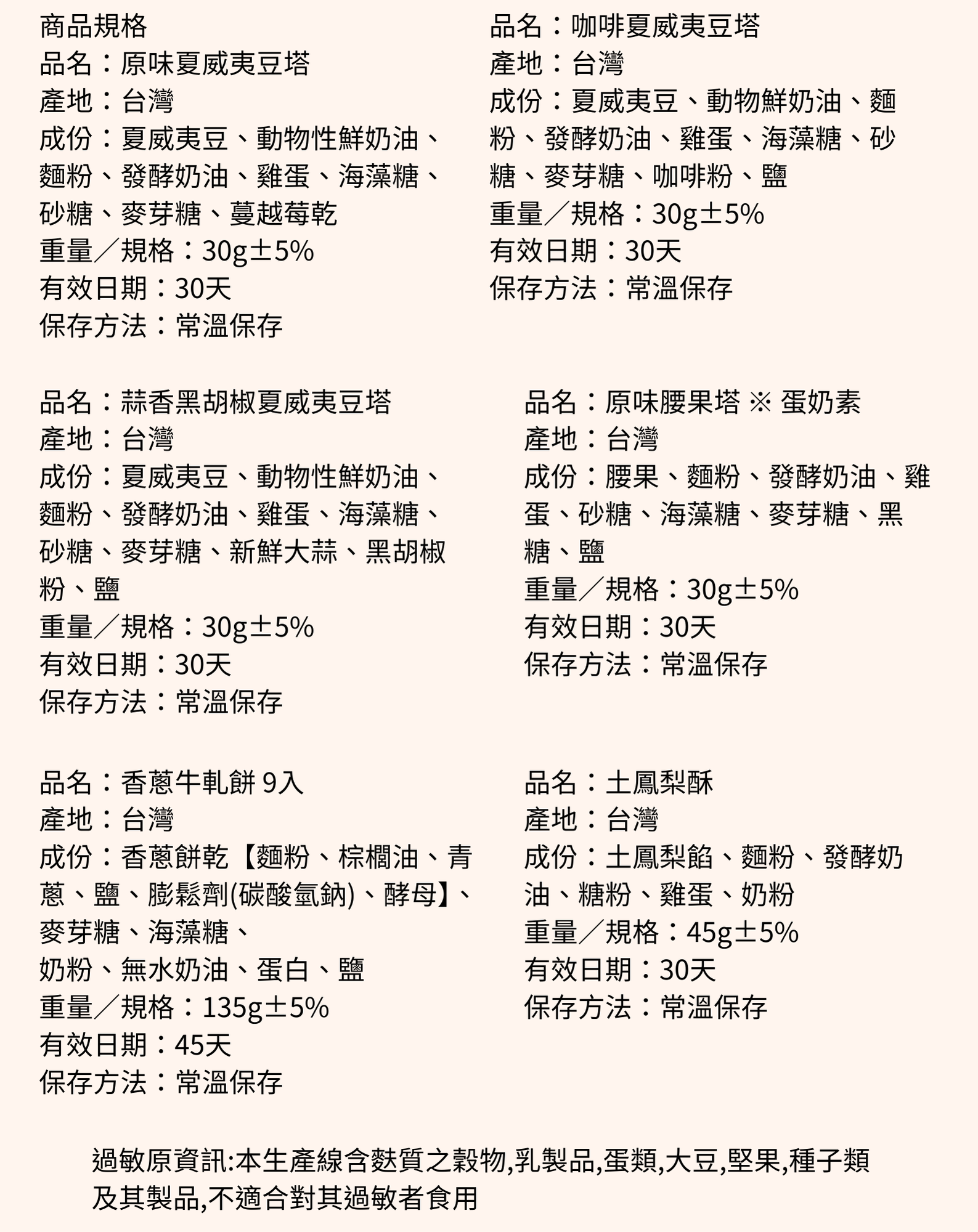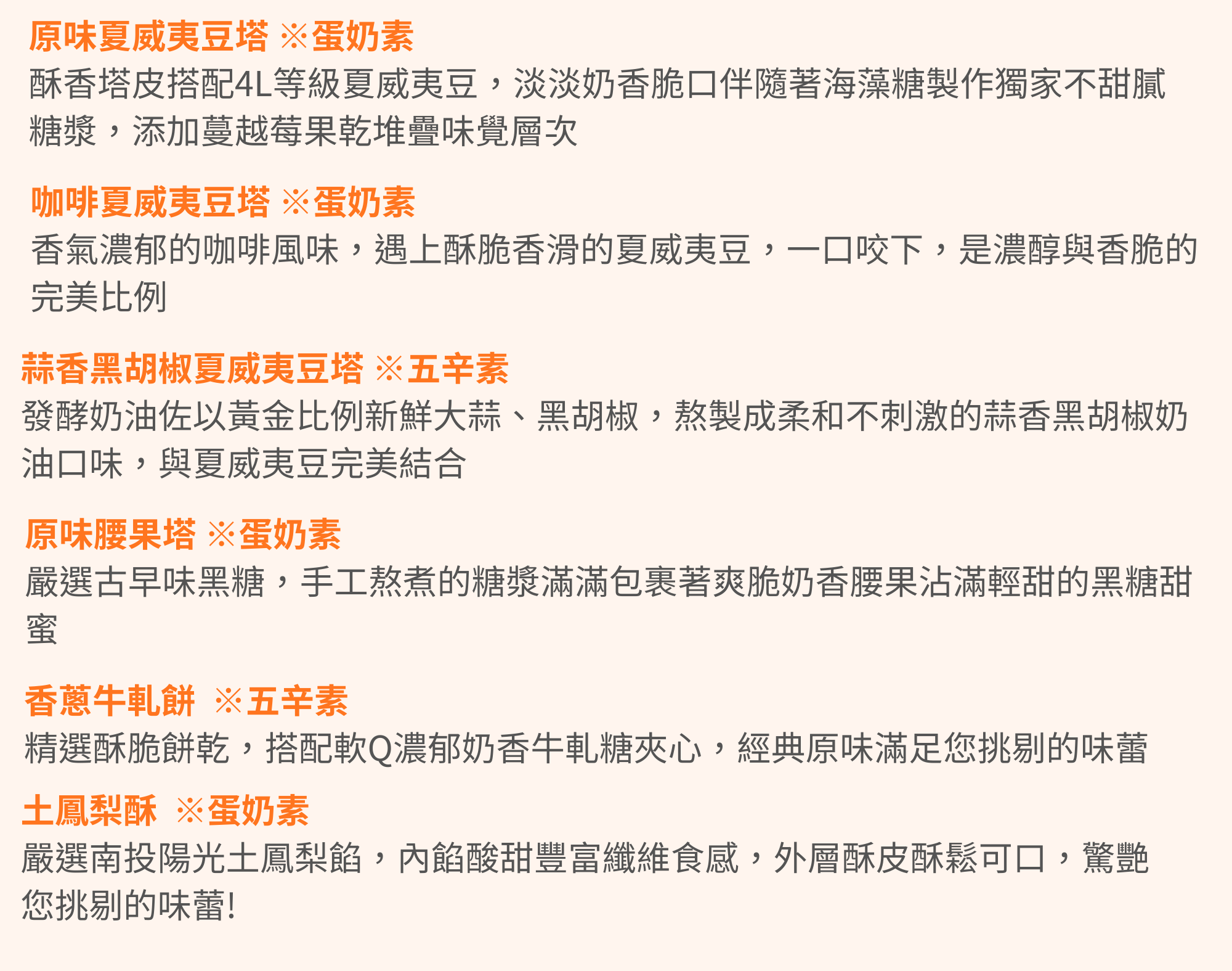 ※商品蒜香黑胡椒夏威夷豆堅果塔為五辛素,其他為蛋奶素
